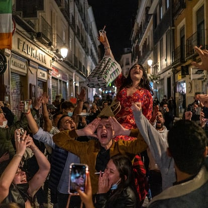 Pero algunas cosas no han cambiado a pesar de las nuevas medidas de seguridad. “Sé de una fiesta en una casa grande a la que podemos ir ahora”, comenta un chico a sus tres acompañantes una vez cumplido el toque de queda. Lo cuenta a menos de 10 metros de un policía en una semidesértica calle de la Cruz, a pocos pasos del pub irlandés. El agente se les acerca y les amenaza con multas de 100 euros por no llevar la mascarilla puesta de forma adecuada y otra amonestación por seguir parados en la calle. El grupo se aleja apenas unos metros y, cuando el agente se marcha, sigue decidiendo a voz en grito si acudir a la fiesta ilegal. “Son 350 metros cuadrados de casa. ¿Cuándo vas a poder estar en una fiesta así?”, argumenta uno de ellos a los indecisos.