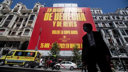 La Copa Davis despliega una lona en la Gran Vía: “En Madrid somos de derecha y de revés”