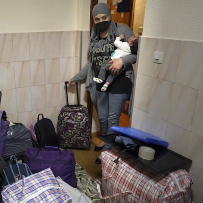 “¿Qué tal la mujer? ¿Ya ha dado a luz?”, pregunta a modo de saludo uno de los agentes al tiempo que da su número de identificación para que conste en la documentación que rellenan delante del portal el gestor y el agente judicial que acuden representando al juez y al secretario judicial. Los policías están al tanto de que hace un mes ya se intentó desahuciar a esta familia, justo el día que Fatima Meknassi, de 30 años, se puso de parto. Hoy, 21 de mayo, Amir celebra en brazos de su madre el primer mes de vida ajeno, a diferencia de sus tres hermanos mayores, a la salida definitiva de la vivienda.