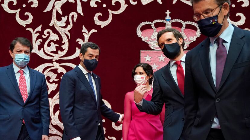 Es una ceremonia monocolor. Color PP. Ahí están Alberto Núñez Feijóo, el presidente de Galicia; Alfonso Fernández Mañueco, el de Castilla y León; Fernando López Miras, su homólogo de Murcia; o Juan Manuel Moreno Bonilla, el de Andalucía. También el alcalde de la capital, José Luis Martínez-Almeida. Y expresidentes regionales como Esperanza Aguirre, Alberto Ruiz-Gallardón, Cristina Cifuentes y Ángel Garrido. Todas las familias populares que quedan, de los rajoyistas a los casadistas, pasando por los aguirristas, acuden a la Real Casa de Correos convocados por la corriente que aspira a ser hegemónica en el partido: el ayusismo.