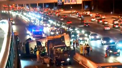 Un aparatoso accidente de dos camiones provoca grandes retenciones en M-30 mientras que un coche incendiado en la M-40 corta esta vía hacia la A-3 en Mercamadrid