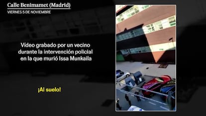 Un portavoz policial de la Jefatura de Madrid le dijo a eldiario.es que el fallecido había acorralado a un policía y que este había disparado después de que le hiriera en la mano con el cuchillo. Pero ni en ese vídeo ni en otro grabado por los vecinos que ha obtenido EL PAÍS se aprecia a ningún agente herido.