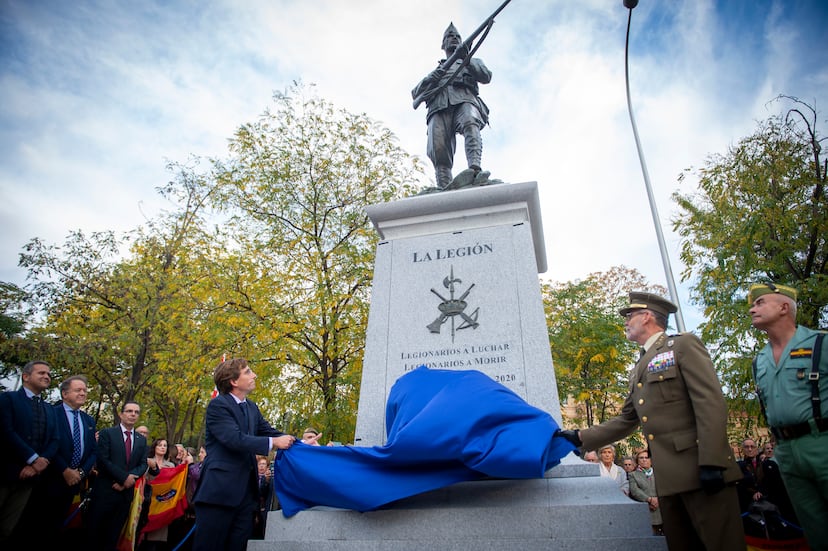 Falta media hora para que el coche gris del alcalde José Luis Martínez-Almeida frene en seco en el paseo de La Castellana. Tres legionarios de mediana edad con el gorro verde y el pecho descubierto ―por donde revolotean pelos rizados, blancos y negros a borbotones― se cuadran a la altura del número 80 de una de las principales calles de la capital. Hay una enorme expectación. Banderas de España por doquier. Pulseras de España en las muñecas, en las fundas de los móviles, en la espalda como superhéroes, pines en las solapas. También dos o tres banderas de los tercios ―mástil en mano― se mueven al son de un tímido viento capitalino de noviembre. Alrededor de 300 madrileños rodean una estatua enorme de casi tres metros de alto y 600 kilos de peso de un legionario de 1921 con una bayoneta en mano, que está a puntito de ser inaugurada en la capital. De pronto, un policía interrumpe a estos tres legionarios que deambulan por La Castellana a pecho descubierto. El policía no se anda con rodeos. La seguridad prima por encima de los saludos: