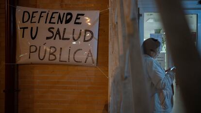 Los usuarios enrollan la pancarta que desplegarán este domingo en la manifestación por la sanidad pública. La enfermera vuelve a entrar en su centro de salud enmarcado por carteles de los vecinos en los que se leen mensajes de apoyo a los profesionales sanitarios. T. espera que no pase nada grave esta noche en la que vuelve a estar sola.