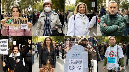 Las calles del centro de Madrid han vuelto a teñirse de blanco. Decenas de miles de sanitarios y pacientes se han manifestado este domingo por el plan de reapertura de las urgencias extrahospitalarias de la presidenta de la Comunidad, Isabel Díaz Ayuso. Esta ha sido la primera gran movilización contra las políticas del Gobierno regional en un contexto de meses de protestas del sector sanitario, que se agudizaron el lunes con una huelga indefinida convocada por el sindicato de médicos (Amyts). Mientras la Delegación del Gobierno cifra los asistentes a la manifestación en 200.000, los organizadores aseguran que han sido 670.000. Muchos han alzado pancartas y pañuelos blancos. Y han gritado eslóganes de apoyo. Detrás de cada pancarta, grito o pañuelo en alto hay una historia de abandono e incertidumbre: desde pacientes octogenarios que se niegan a aceptar las consultas por videollamada hasta médicos al borde del colapso.