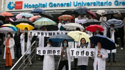 “Atención primaria somos todos”, reza una pancarta improvisada con varios folios blancos plastificados. Es de los profesionales sanitarios del Hospital Gregorio Marañón, que se han concentrado este martes en las escaleras del centro para mostrar su apoyo a los médicos de familia y pediatras en huelga desde hace casi cuatro semanas. “Hay que mojarse, en el sentido literal”, se animaban unos a otros. Al menos 40 personas ―médicos, enfermeras y personal administrativo― se han reunido bajo la lluvia con sus batas blancas, fonendoscopios al cuello y paraguas en mano.