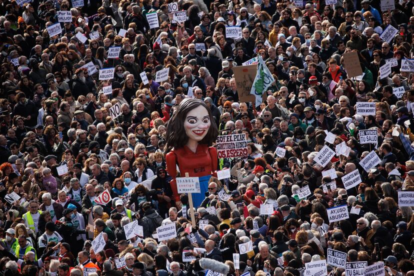La primera respuesta del equipo de la presidenta de Madrid, Isabel Díaz Ayuso a la masiva manifestación de este domingo en defensa de la sanidad pública llegó poco después del mediodía, cuando aún no se había llenado la plaza de Cibeles. Se llamaba “Datos reales frente a los bulos en sanidad” y consistía en un listado de 10 puntos enviado a los medios de comunicación con unas afirmaciones tan positivas que contrastaban profundamente con los motivos de queja de las multitudes, unas 250.000 personas, según la delegación del Gobierno. La lista es, según expertos y los propios afectados, una selección a conveniencia que esconde los agujeros negros del sistema. Estos son los 10 puntos y la verificación que ha podido hacer EL PAÍS.