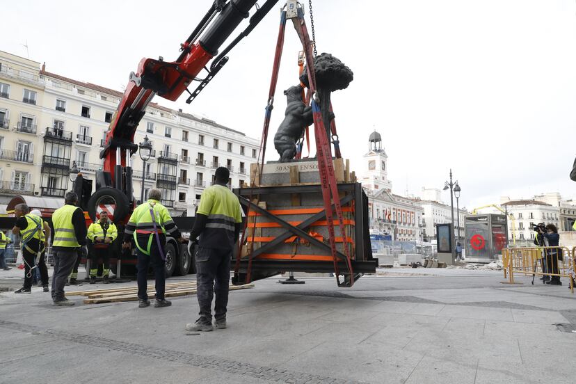 Ojo a los turistas y madrileños, porque para hacerse la foto ante la icónica estatua del Oso y el Madroño hay que buscar su nueva ubicación en la Puerta del Sol. El símbolo del madrileñismo ha sido trasladado la mañana de este viernes de lugar en el marco de las enésimas obras de remodelación de la Puerta del Sol, que José Luis Martínez-Almeida no podrá inaugurar esta legislatura porque no estará terminada antes de la convocatoria de las elecciones municipales.