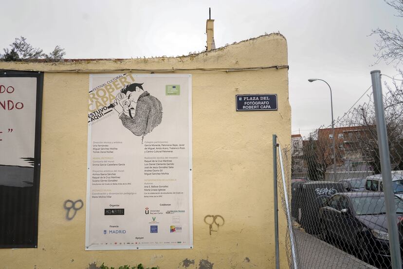 Justo al lado del mítico edificio de la calle Peironcely número 10, donde hay un conjunto de viviendas de clase obrera del distrito de Puente de Vallecas, había una placa que conmemoraba a Robert Capa, un fotógrafo hún...