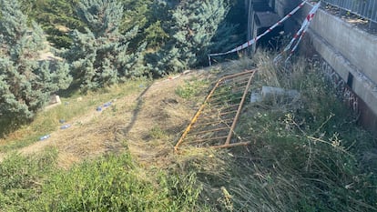 A un lado del puente están las vías del tren y, al otro, un parque con un talud lleno de tierra y vegetación. Los efectivos han extinguido en apenas media hora el fuego, que se había desatado en enseres y escombros alojados bajo el puente, construido en 1971 para conectar la calle de Méndez Álvaro con las del Doctor Esquerdo y del Conde de Casal, y que fue desmantelado parcialmente este año.