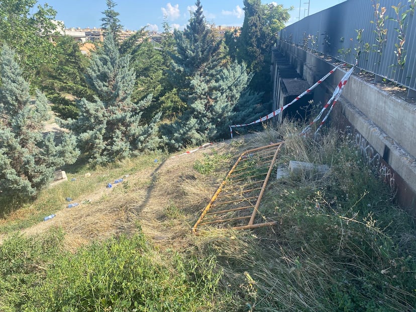 A un lado del puente están las vías del tren y, al otro, un parque con un talud lleno de tierra y vegetación. Los efectivos han extinguido en apenas media hora el fuego, que se había desatado en enseres y escombros alojados bajo el puente, construido en 1971 para conectar la calle de Méndez Álvaro con las del Doctor Esquerdo y del Conde de Casal, y que fue desmantelado parcialmente este año.