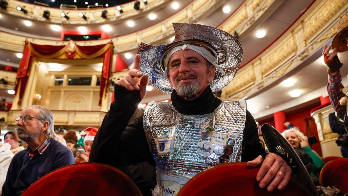 La majestuosidad del patio de butacas del Teatro Real, con sus oropeles y terciopelos, contrasta con el cachondeo que se respira. El de los fans irredentos del sorteo que cada año acuden disfrazados, a ver si atraen la suerte. Donde a veces se asiste a representaciones de Rigoletto, Dido y Eneas o Madama Butterfly, ahora hay una bruja, un perrito caliente, un centurión romano, dos zorretes, el citado Don Quijote acompañado por Sancho Panza, Dulcinea del Toboso y el mismísimo Cervantes. Y no solo un Papa, sino dos (¡cisma en la Iglesia!).