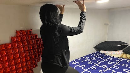 El único rincón íntimo de Pamela y Diego en España tenía un corazón de plástico gigante pegado a la pared y un colchón de matrimonio en el suelo —que ni siquiera venía incluido en el precio— al que había que entrar gateando. “Acá solo puedes estar tumbado”, describía Diego en cuclillas, rozando su cabeza con el techo. A un lado de la cama, el calentador de agua; y debajo de ellos, la única ducha de la que disponían los siete inquilinos. Cada día, subían y bajaban esos endebles escalones de madera al menos dos veces — “Yo ya los bajo rápido, no se crea”, bromeaba Pamela— y en un espacio de no más de dos metros cuadrados debajo de la escalera, guardaban bolsas de arroz y de pasta, junto a los zapatos, abrigos y ropa doblada. La puerta de metal que conecta su habitáculo con el pasillo la cerraban cada día con un candado. Un martes de mediados de marzo, tuvieron que abrir la puerta de la calle, la única corriente de aire posible, para que se secara la ropa tendida.