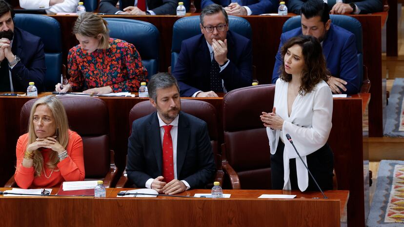 Ayuso vuelve al pleno igual que la última vez que estuvo: cargando contra Sánchez. Cuando se felicita de la actitud de su gobierno ante los informadores (”No perseguimos a los medios de comunicación que nos son incómodos como hacen los señores de la izquierda”, dice), encuentra la respuesta de Bergerot, que la tilda de “jefa de las amenazas a periodistas”.