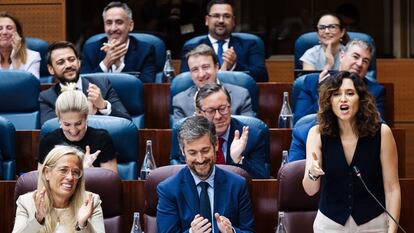 Hay personalidades que llenan una habitación, incluso cuando no están presentes. Ocurre este jueves con el presidente de Argentina, Javier Milei, que centra la mayoría de debates en la sesión de control al Gobierno de Isabel Díaz Ayuso que se celebra en la Asamblea regional. Como si sintiera que le quitan algo suyo, la portavoz de Vox, Rocío Monasterio, advierte a la presidenta de Madrid sobre la recepción que ofrecerá el viernes al líder sudamericano: “Como Milei se entere de que ha aumentado el gasto público y de que paga a los medios subvencionados, va a entrar en Sol con una motosierra”. Juan Lobato, el líder del PSOE de Madrid, afea a Ayuso que le vaya a conceder a Milei una medalla. “¡No lo hace en mi nombre ni en el de millones de madrileños que creemos en el respeto y la buena política, que es lo contrario a lo que Milei y usted hacen, que es odio constante!”, exclama. Y la baronesa conservadora lo escucha todo sonriente y feliz, sin puro, pero igual que si fuera Hannibal Smith a punto de decir “me encanta que los planes salgan bien” en un capítulo del Equipo A, porque acaba de dar un paso más en su estrategia de ocupar la agenda política nacional y absorber a los votantes de Vox.