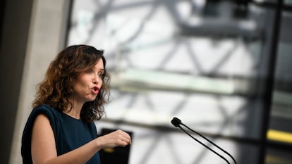 La presidenta de la Comunidad de Madrid, Isabel Díaz Ayuso, durante una rueda de prensa en la inauguración de la exposición Bolivariano el lunes en Madrid.Foto: Fernando Sánchez (Europa Press)