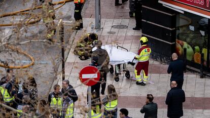 Desde su ventana, ha observado varias dotaciones, que llegaban conforme avanzaba la humareda. “En grupos de seis los bomberos entraban y salían del interior del edificio”, añade. Ha sido entonces cuando, desde uno de los camiones, han metido un cable de acero hacia el garaje. “Así sacaron a tres personas arrastradas. En dos ambulancias escoltadas se los han llevado a todos”, finaliza el vecino, abogado de profesión.