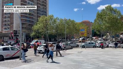 Jorge V., al igual que otros viandantes consultados por EL PAÍS, ve caer al suelo a una niña tras pasar ese coche, a la altura del número 28 del paseo de Extremadura, junto a una ferretería.