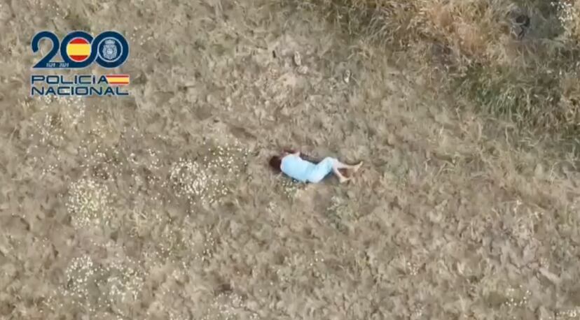 Imágenes compartidas por la Policía Nacional muestran el momento en que el dron graba a la mujer tendida en el suelo en una zona de campo. Los agentes consiguen localizarla e introducirla de un coche patrulla para, a continuación, subirla en una ambulancia del Summa 112.