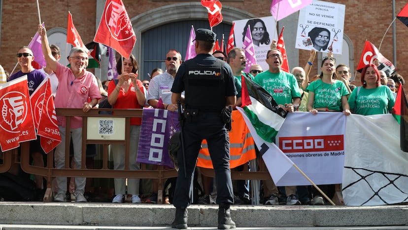 La presidenta de la Comunidad de Madrid, Isabel Díaz Ayuso, ha empleado este viernes su intervención en la inauguración del curso universitario 2025-2026, celebrada en la Universidad de Alcalá de Henares (UAH), para lanzar una advertencia velada contra la colocación de símbolos a favor de Palestina y en contra de la invasión de Gaza por parte de Israel en los colegios de la región. “No consentiremos que se instrumentalicen los centros para hacer guerra ideológica”, ha dicho durante su discurso Díaz Ayuso, que ha sido recibida por una concentración convocada por los sindicatos UGT y CC OO en la que profesionales y estudiantes de la universidad han protestado contra la “infrafinanciación” de las universidades.