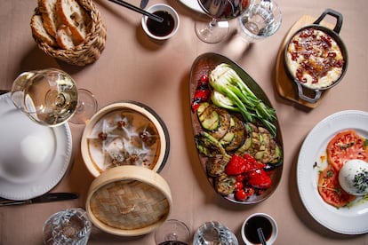 La propuesta se mueve entre dos fuegos: uno literal, la brasa; y otro más simbólico, el intento de reinterpretar la cocina asiática bajo códigos que encajan en el entorno. “No queríamos reproducir recetas tal cual, sino traer la esencia”, asegura Felipe Bao, chef ejecutivo de Grupo China Crown. En la carta conviven brochetas de pollo con salsa de cacahuete, arroz crispy con chipirones, dim sum variados o cintas de arroz estilo cantonés con ternera.