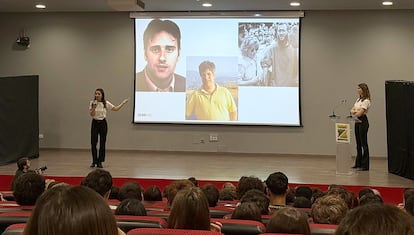 “Su violencia duró 52 años, la Guerra Civil, tres. Para que veáis el paradigma y la necesidad de estudiar esto en las aulas”, ha expresado Botella antes de poner a los alumnos un vídeo de sus allegados narrando lo vivido. “Lo que es tristísimo es que ahora, con el paso de los años, la gente, en aras de no sé qué pacificación, de no sé qué concordia, de no sé qué, pueda olvidar los años que se pasaron en este país”, comenta una mujer, familiar suya, a través de la pantalla del salón de actos.