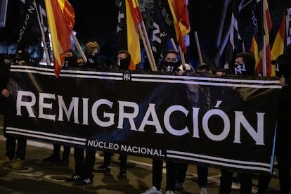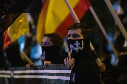 Bastión Frontal, Hogar Social, Democracia Nacional, Skin Moncloa... grupos y subgrupos diluidos en los últimos tiempos han encontrado un nuevo puerto de extrema derecha en Madrid en el que recalar y sumar fuerzas para resurgir con nuevo ímpetu, espíritu muy joven y ambiciones políticas. Se han autodenominado Núcleo Nacional (NN), aunque el germen de este movimiento de extrema derecha surge —según fuentes policiales— en las protestas de Ferraz de noviembre de 2023, frente a la sede del PSOE. Entonces acuñaron el nombre de “Noviembre Nacional”. Hoy, dos años más tarde, tras una estudiada campaña de marketing y merchandising con la que han dado forma a su marca y rienda suelta a su estética de embozos y ropa negra ajustada, son ya 1.500 socios, según las mismas fuentes. “Muy jóvenes en su mayoría y que abonan una cuota de diez euros mensuales”, apuntan fuentes de los servicios de Información de la Policía. Tienen su “Nido” en Las Tablas, como han denominado al amplio local —con gimnasio incluido— en el que lucen su simbología, convocan a sus actuales y potenciales adeptos y abultan la musculatura de sus cuerpos.