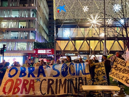 Las familias, acompañadas por la Plataforma de Afectados por la Hipoteca (PAH) de Vallecas y el Sindicato de Vivienda de Moratalaz, se han plantado frente a las oficinas de Caixabank en la plaza de Colón esta tarde para protestar contra la empresa. “Entramos a vivir hace seis años con un contrato de alquiler que decía social. ¿Cómo tiene que haber cambiado nuestra vida para que ahora nos propongan comprar el piso en 350.000 euros?”, se pregunta Vanesa García, vecina del bloque de Pinto que recientemente ha pasado de las manos de la InmoCaixa (la rama que gestiona las viviendas de la empresa) a las de un fondo de inversión. Según Vanesa, cuyo contrato se vence en mayo de 2026, la propuesta de venta ni siquiera ha llegado antes de esa operación, sino hace unas pocas semanas.