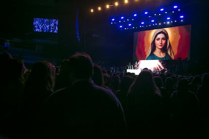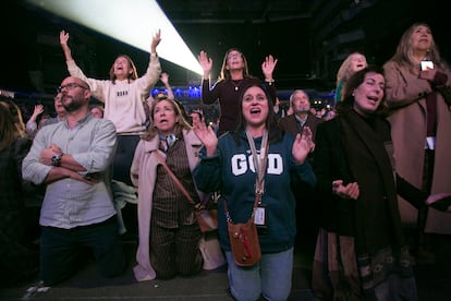 Suena un riff de guitarra eléctrica en un escenario presidido por una cruz iluminada y salta un grupo de jóvenes para enchufar al público. “¡Que lo oiga toda España. Que se escuche el nombre de Cristo!”. Algo más de 6.000 personas tocan las palmas al son del estribillo “Alaba a Dios mi corazón”. Empiezan así este lunes tres horas y media de espectáculo religioso en el Movistar Arena que incluyen la música de la filial en España de la iglesia protestante australiana Hillsong, charlas de influencers católicos y una ceremonia con un rezo del Padre Nuestro.