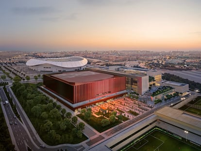 El alcalde no ha especificado cuándo comenzarán las obras de este nuevo complejo, solo ha avanzado que lo harán “próximamente” y que se extenderán hasta finales de 2030, cuando el pabellón, la universidad privada y el centro deportivo se unirán a la Ciudad del Deporte, también en construcción y proyectada por el club. De hecho, todo lo propuesto este martes por Almeida parte de una iniciativa privada del Atlético que presentó, a través de Barsento, en enero de 2025 para la construcción y explotación del área. “Urgía dar una solución al centro acuático y la solución vino de la mano de Miguel Ángel Gil [consejero delegado del club]”, ha señalado el alcalde durante la presentación del proyecto. Gil también ha participado en el acto: “Llevamos 15 años intentando buscar alternativas a este esqueleto y hemos acertado”.
