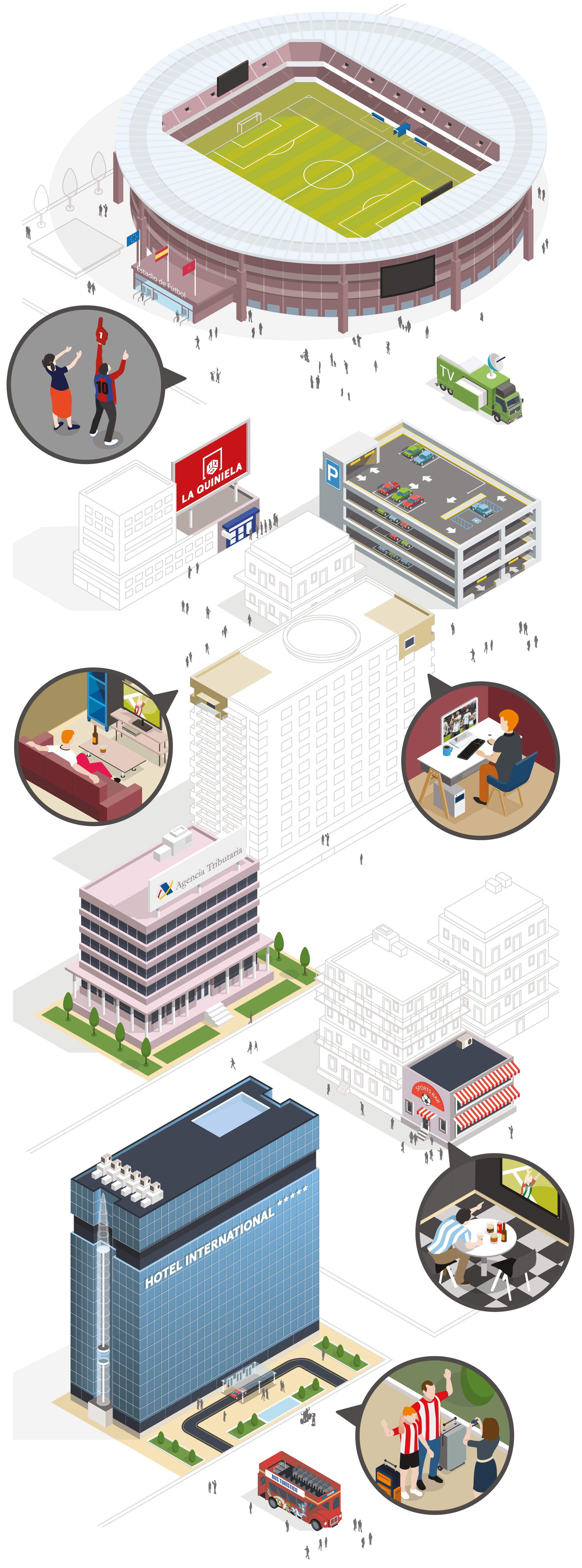 El bar de Lleida, el Casal d'Alfés, entraría en lo que PwC llama efecto tractor. "Una empresa produce algo que se usa para vender otro tipo de producto", explica Esteve. "El fútbol es un impulso para el sector de los bares, de los restaurantes, hoteles, televisión, transporte. Ninguno de ellos aparece en las cuentas de los clubes, pero están impactados por ellas". La cadena de bares Lizarran, extendida por toda España, también refleja este impacto. Sara Vega, su directora de comunicación, señala: "Más de la mitad de nuestros 200 bares emiten con asiduidad partidos de fútbol. Esos días las ventas se incrementan en torno a un 22%".