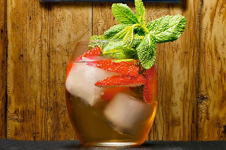 Verterlo en un vaso con fresas cortadas en rodajas y mucho hielo