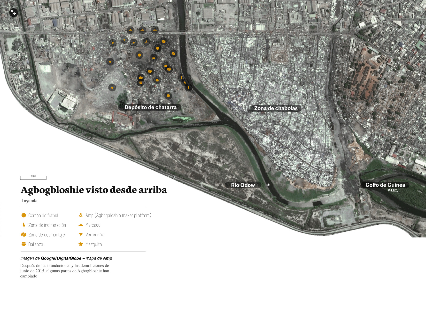 Una estación de control del aire instalada en el vertedero de Agbogbloshie ha detectado hierro, plomo y cobre. Concretamente, se han hallado 1,5 mg/m³ de cobre (el límite permitido está en 1,0 mg), 7,8 mg/m³ de hierro (límite: 5,0) y 0,72 mg/m³ de plomo (límite: 0,15). Estos son límites establecidos para zonas de trabajo, pero en realidad Agbogbloshie constituye toda una zona residencial de Accra, con unos 90.000 habitantes.