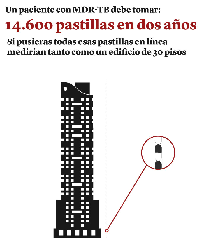En esa clase de entornos, que representan la cotidianidad en lugares como Kayelitsha, la tuberculosis sigue cobrándose sus víctimas. "En 2010 me diagnosticaron tuberculosis. Empecé a tomar las medicinas que me recomendaron pero mi cuerpo no respondía a ellas, los medicamentos no me hacían efecto", cuenta Phumeza en su jardín. "Después de varios análisis me dijeron que no tenía la tuberculosis corriente, sensible a los medicamentos, sino el tipo TB-MR (multirresistente)". Se trata de una forma mucho más peligrosa producida por mutaciones genéticas de la bacteria debidas a la toma incorrecta de las medicinas o a la interrupción del tratamiento. En consecuencia, resiste al menos a dos de los remedios habituales contra la enfermedad, denominados comúnmente "fármacos de primera línea". Necesita una terapia de dos años, la ingestión de unas 14.600 pastillas y cientos de inyecciones, un tratamiento caro y penoso no exento de riesgos para la salud.