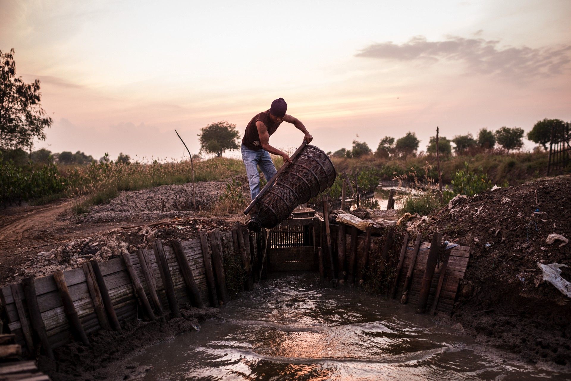 Al atardecer, Supiró, de 32 años, saca un bubu (una trampa para gambas) de su estanque piscícola. Además de estos crustáceos, captura cangrejos, peces pequeños y hasta serpientes de agua. Banten, Java, Indonesia, 2014.