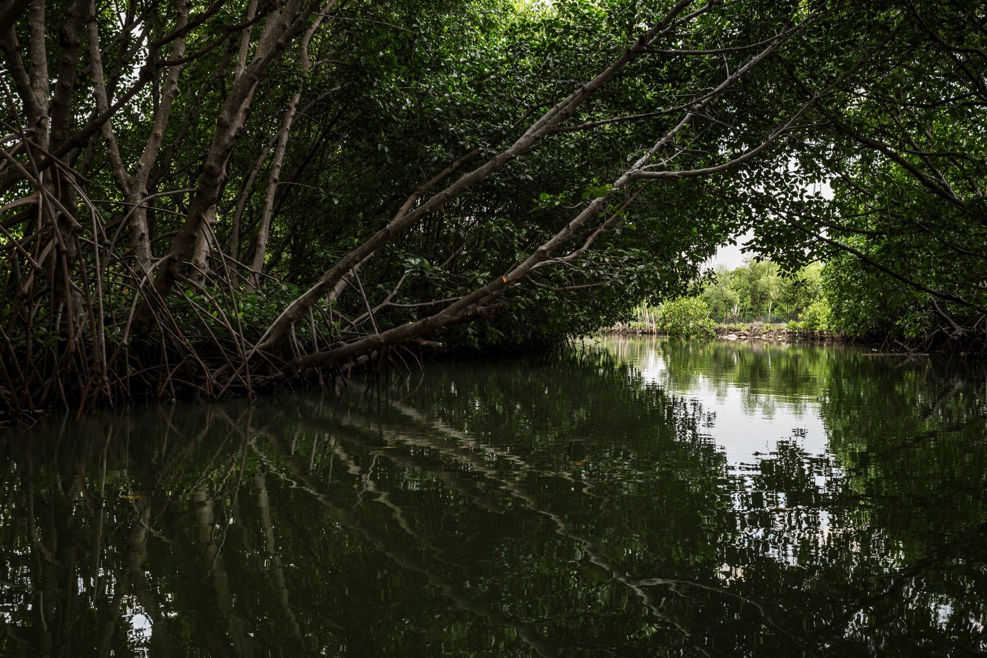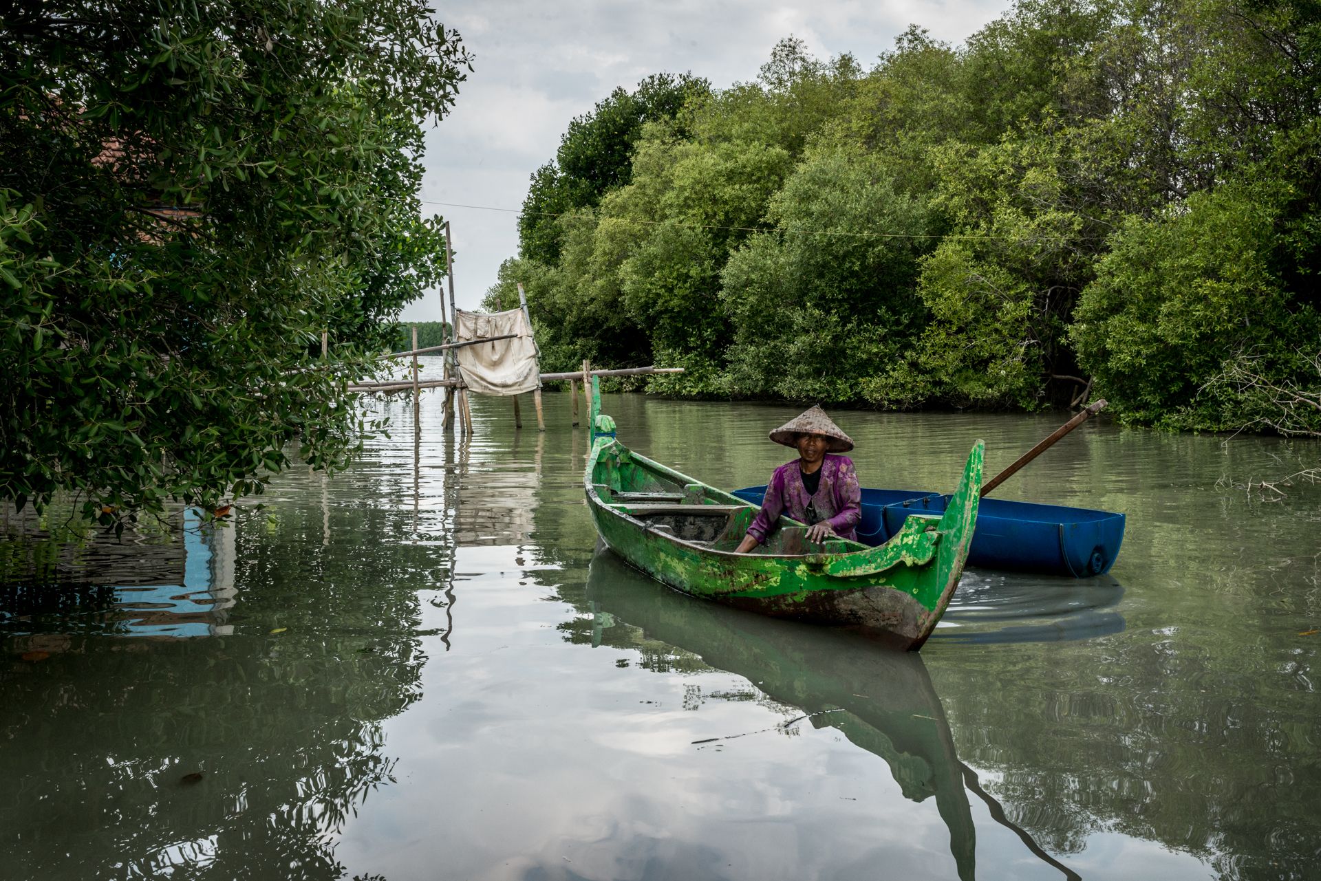 Muhammad Arifin y los miembros de la Asociación Prenjak Tapak recorren canales cubiertos por el denso follaje de los mangles. Algunos árboles tienen más de 30 años. Tanto los diques como los estanques están a la sombra de estos árboles.