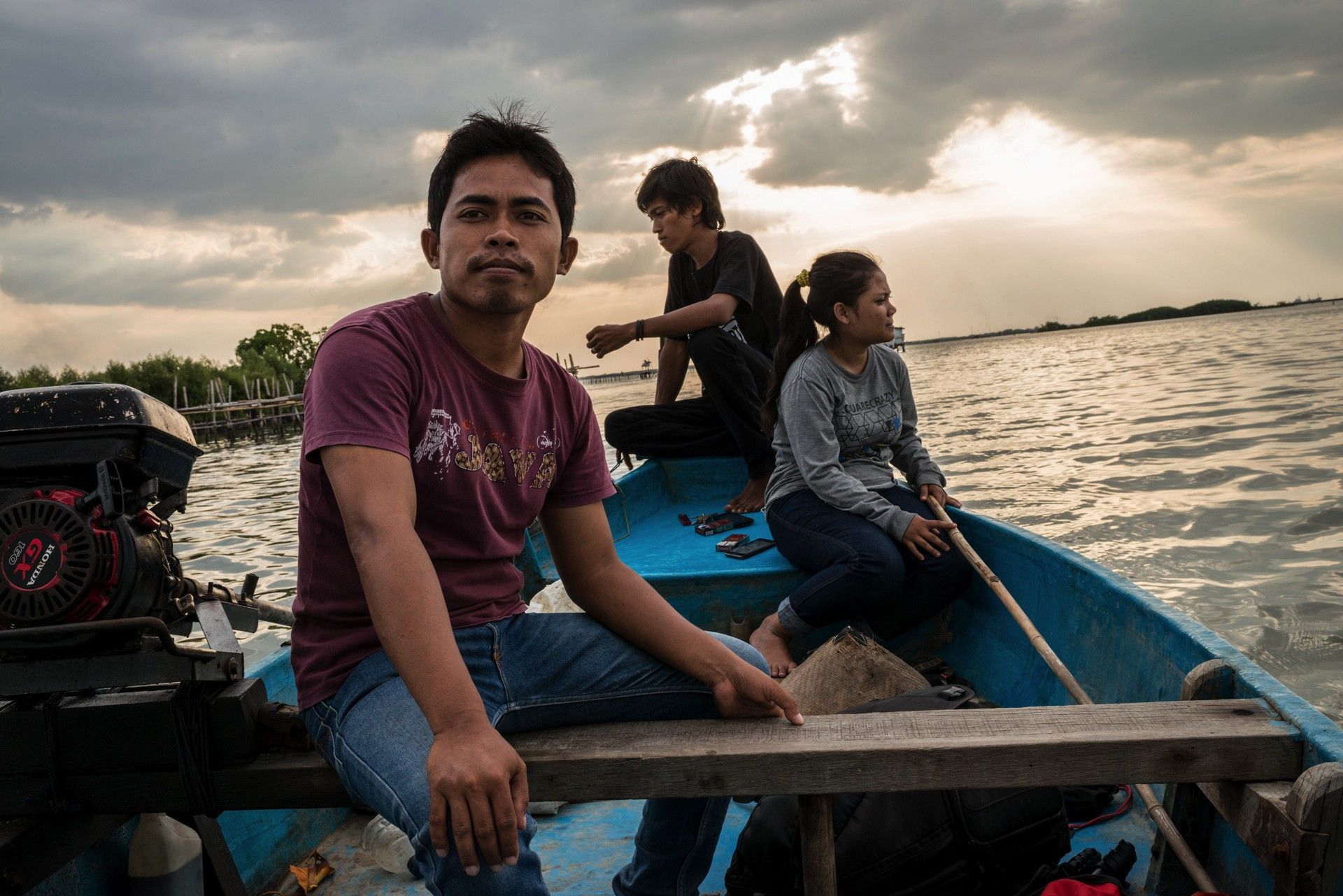 Arifin tiene 29 años y es el presidente de la comunidad Prenjak para la protección de los manglares del pueblo costero de Tapak. Detrás de él, Aris, de 20 años, responsable de las relaciones con los medios de comunicación extranjeros, y Nur, de 21, tesorero. Semarang, Java, Indonesia, 2016.
