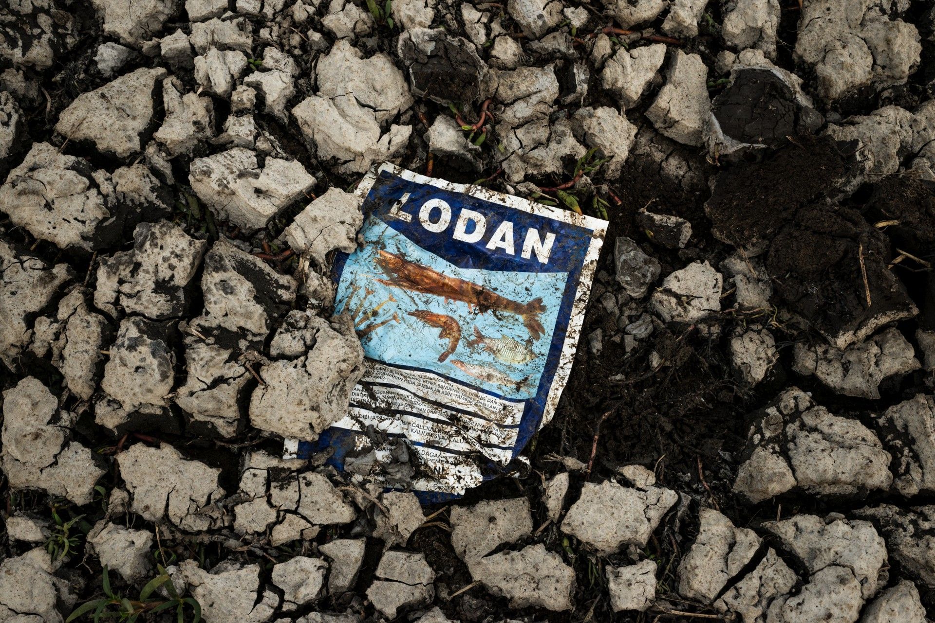 Una bolsa vacía de comida para gambas asoma en el fango cuarteado de los bancales de un tambak. La ausencia de mangles ha destruido el ecosistema. Los granjeros se ven obligados a comprar nutrientes, alimento, antibióticos, aditivos y molusquicidas para criar las gambas. Banten, Java, Indonesia, 2016.