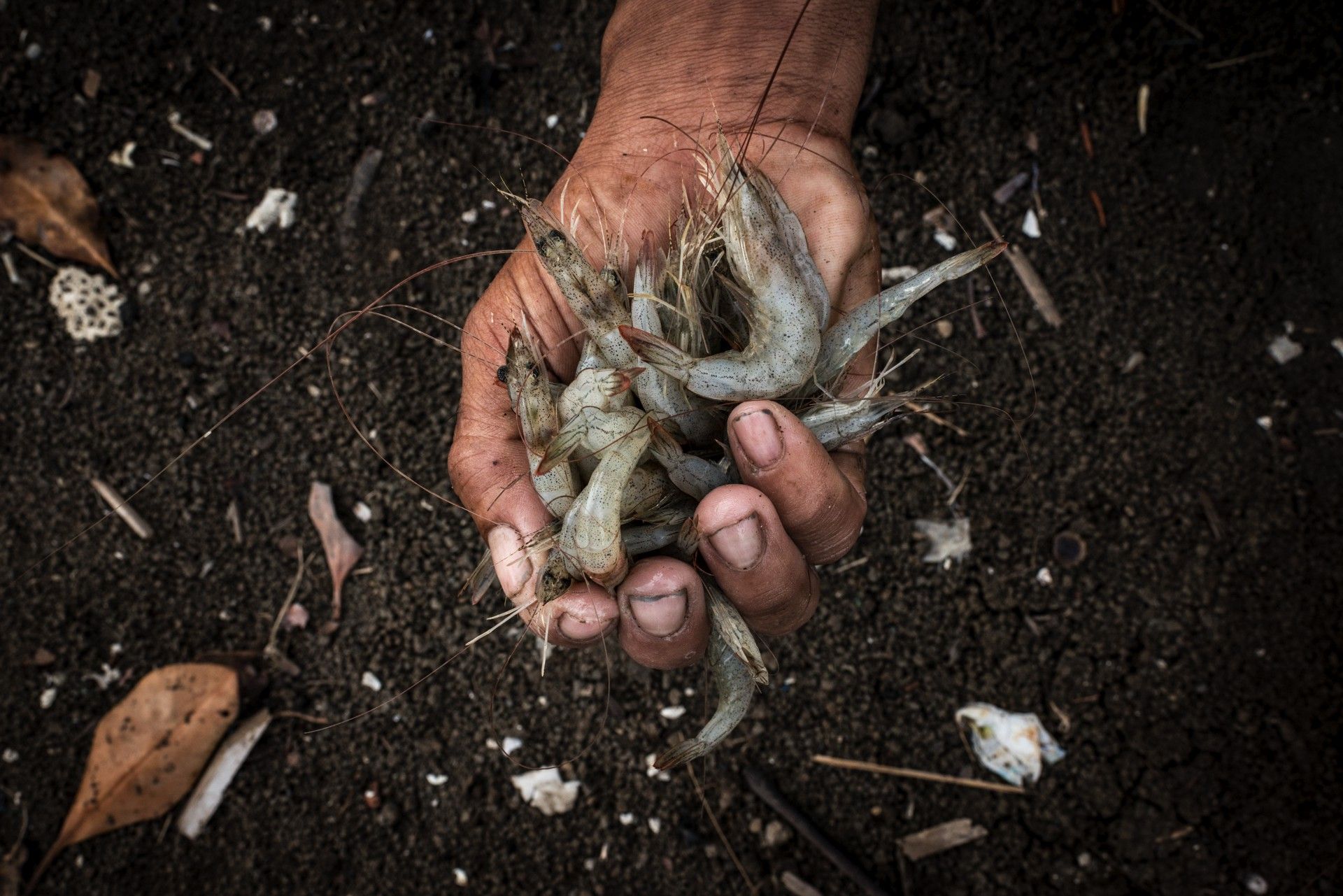 Kasrudin tiene 36 años y es un criador de gambas del pueblo costero de Sawah Luhur. Sostiene en la mano un puñado de gambas recién cogidas. ¿Cuánto tiempo durará su negocio? Banten, Java, Indonesia, 2016.