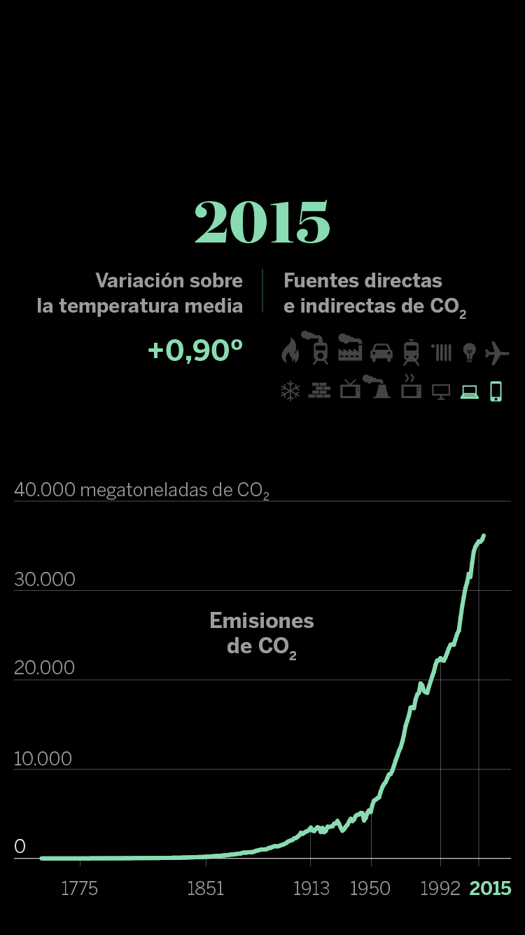 En cuanto a las infografías sobre la evolución del CO₂ vinculada a la acción humana, los datos de emisiones proceden del ‘Atlas del carbono’ del Global Carbon Project. En muchas ocasiones, esa relación se establece con las fuentes de energía (gas, petróleo y carbón, fundamentalmente) que, al quemarse, son las que emiten finalmente el dañino CO₂. Sin embargo, en este caso, para dejar más clara la relación entre causa (la acción del hombre en su vida cotidiana) y efecto (los gases), es preferible presentarlo con los principales adelantos tecnológicos y desarrollos sociales que, en cada periodo, han desencadenado aumentos exponenciales del consumo energético y, por lo tanto, de las emisiones.