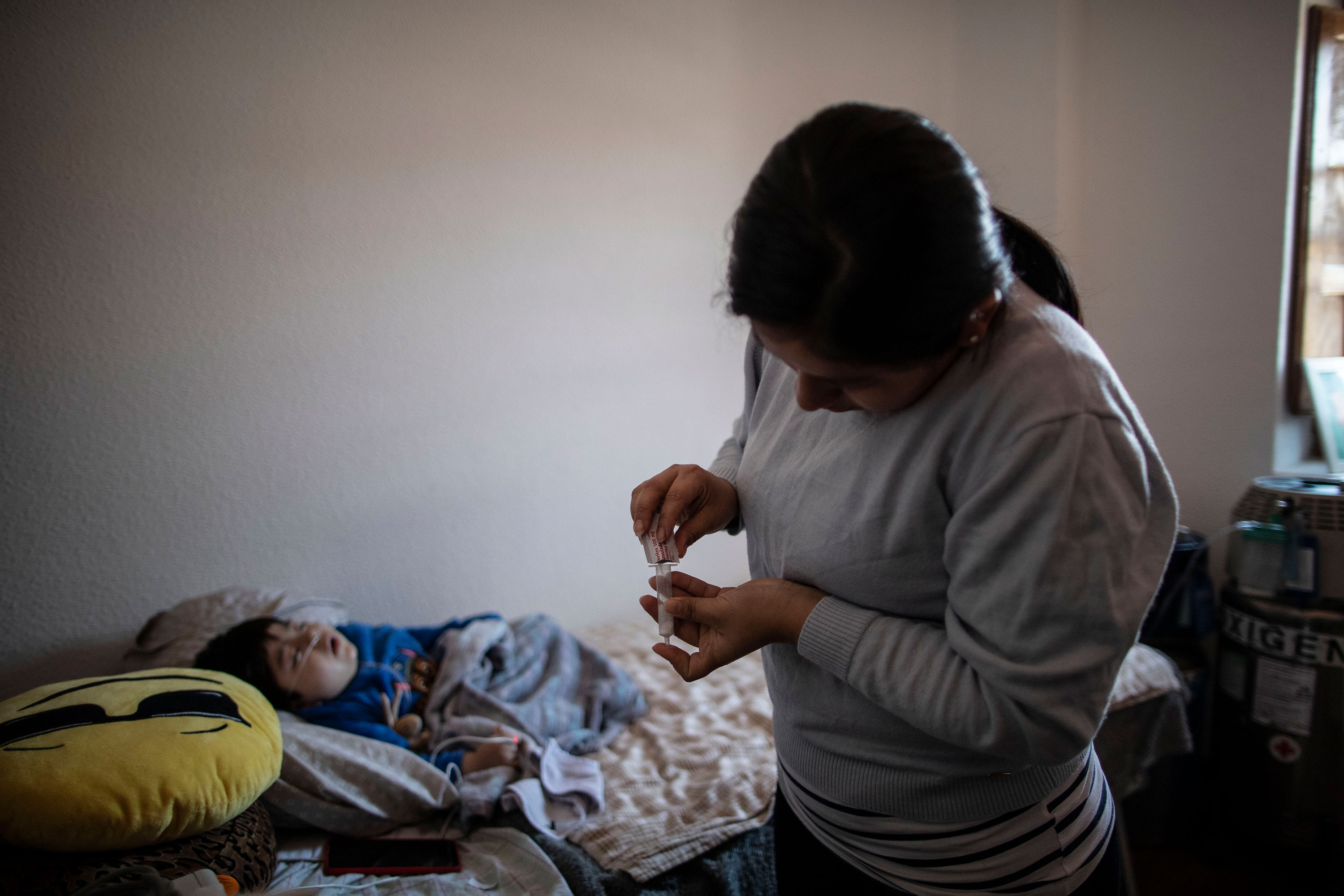 Una de las habitaciones de la casa vive un drama paralelo que nada tiene que ver con la covid-19. Cristina, la hija de 23 años de Edwin, pasa las 24 horas del día con su hijo Allen desde que nació. El pequeño, de dos años, sufre una enfermedad rara que afecta al desarrollo cerebral. Es ciego y convulsiona o se atraganta con frecuencia. A la hora de la comida, Cristina sale a por su ración de comida y vuelve otra vez a la habitación. Después le da el biberón a Allen. “No sale jamás de ahí. Ni antes del confinamiento”, susurra Rosmery.