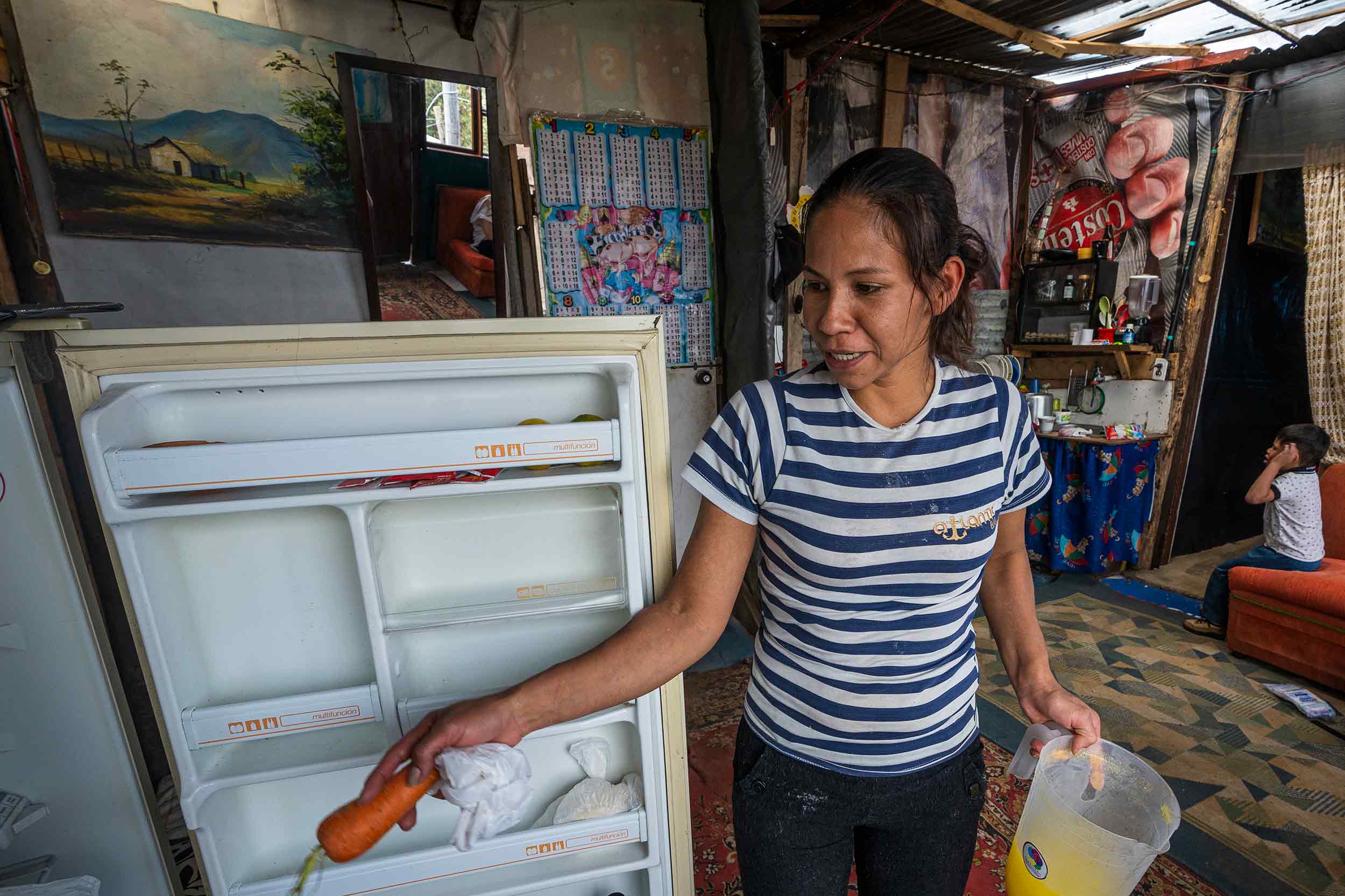 Una zanahoria, un pedazo de piña y un arroz de hace unos días. Es más fácil enumerar lo que tiene la familia de Villarraga en el refrigerador que lo que le falta. Patricia, de 38 años, abre la nevera buscando con qué hacer la comida. Pero no hay nada que cocinar. Decide hacer lentejas con arroz y zumo de piña de almuerzo para ella, su esposo y sus dos hijos de cinco y siete años.