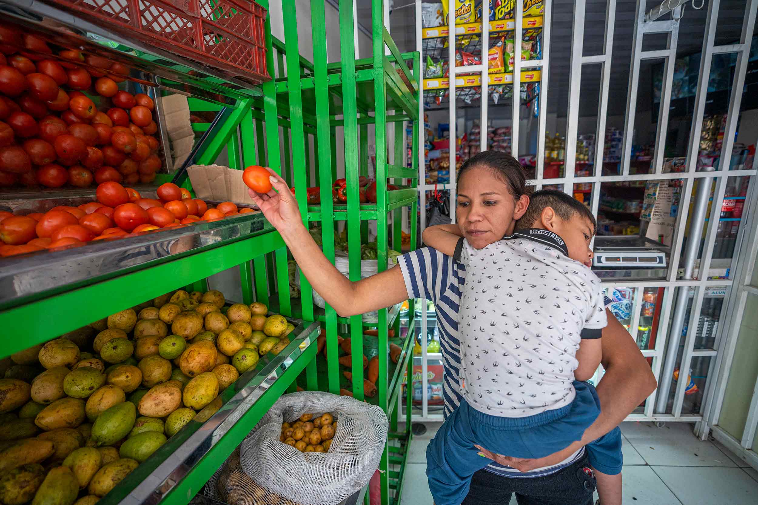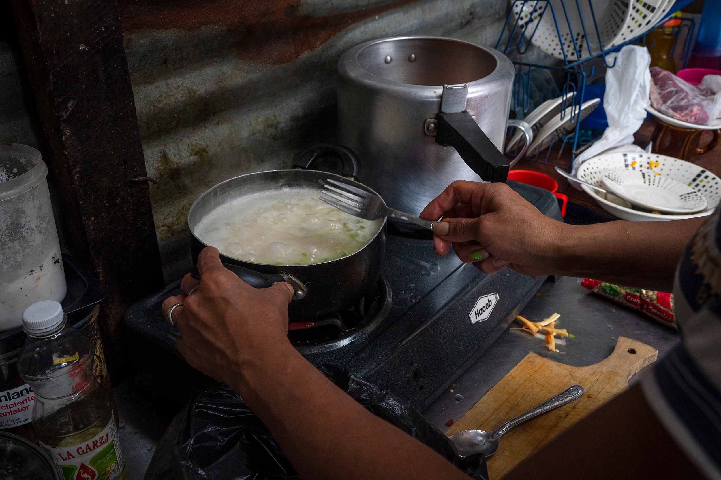 Patricia mantiene la esperanza de que algún día las cosas para su familia serán distintas: “Se vale soñar”, dice mientras empieza a cocinar. Coge la cebolla y la lava. Su hijo empieza a llorar y tiene que parar. Pone una olla a fuego lento y a sofreír el tomate en otra, pero solo tiene un fogón que le funciona, por lo que tiene que ir intercambiando las ollas en el único que tiene. “Cuando no hay plata, toca comer solo lentejas con sal”, cuenta.