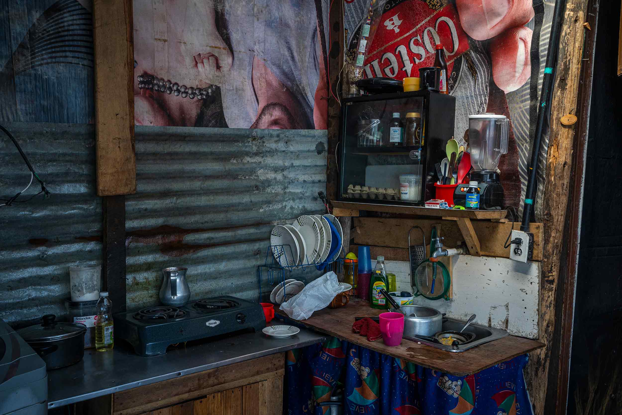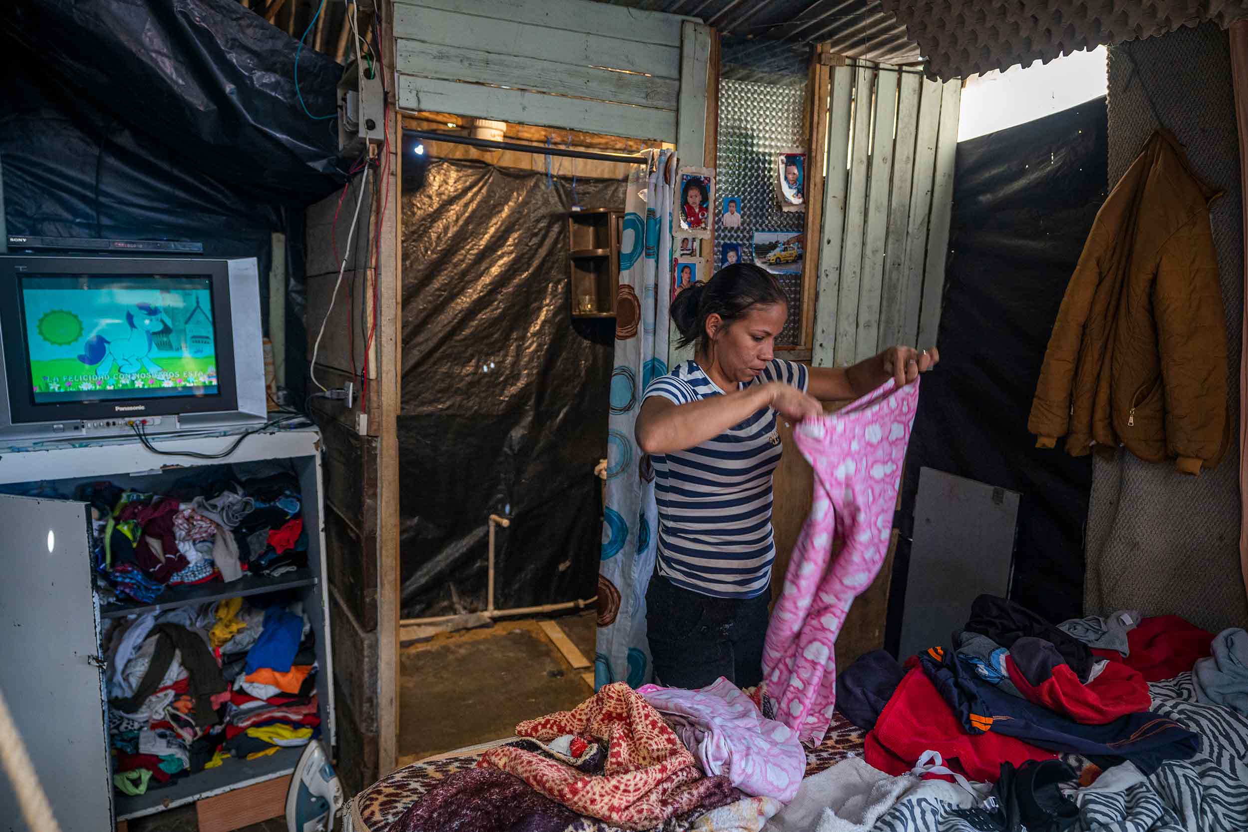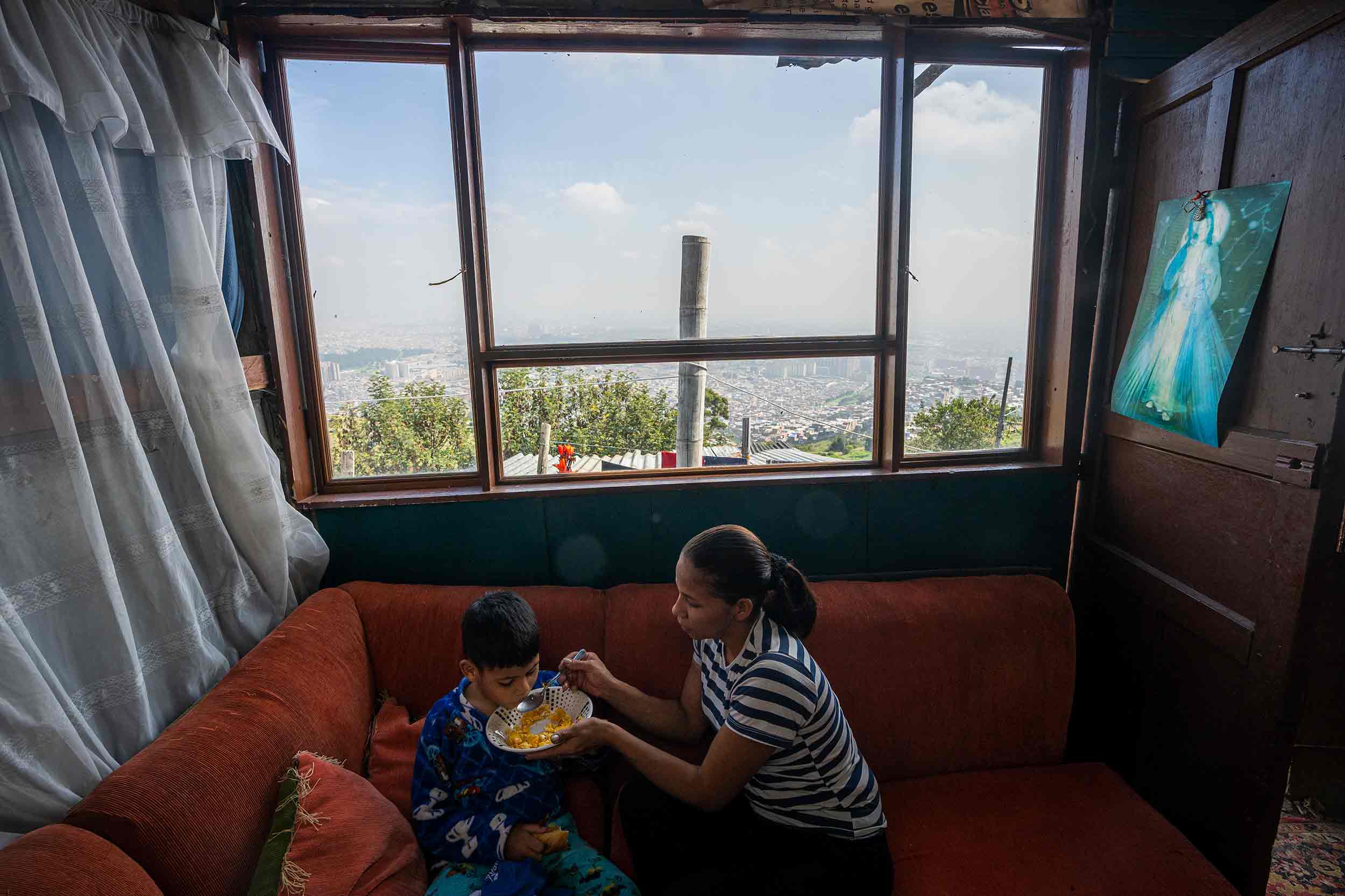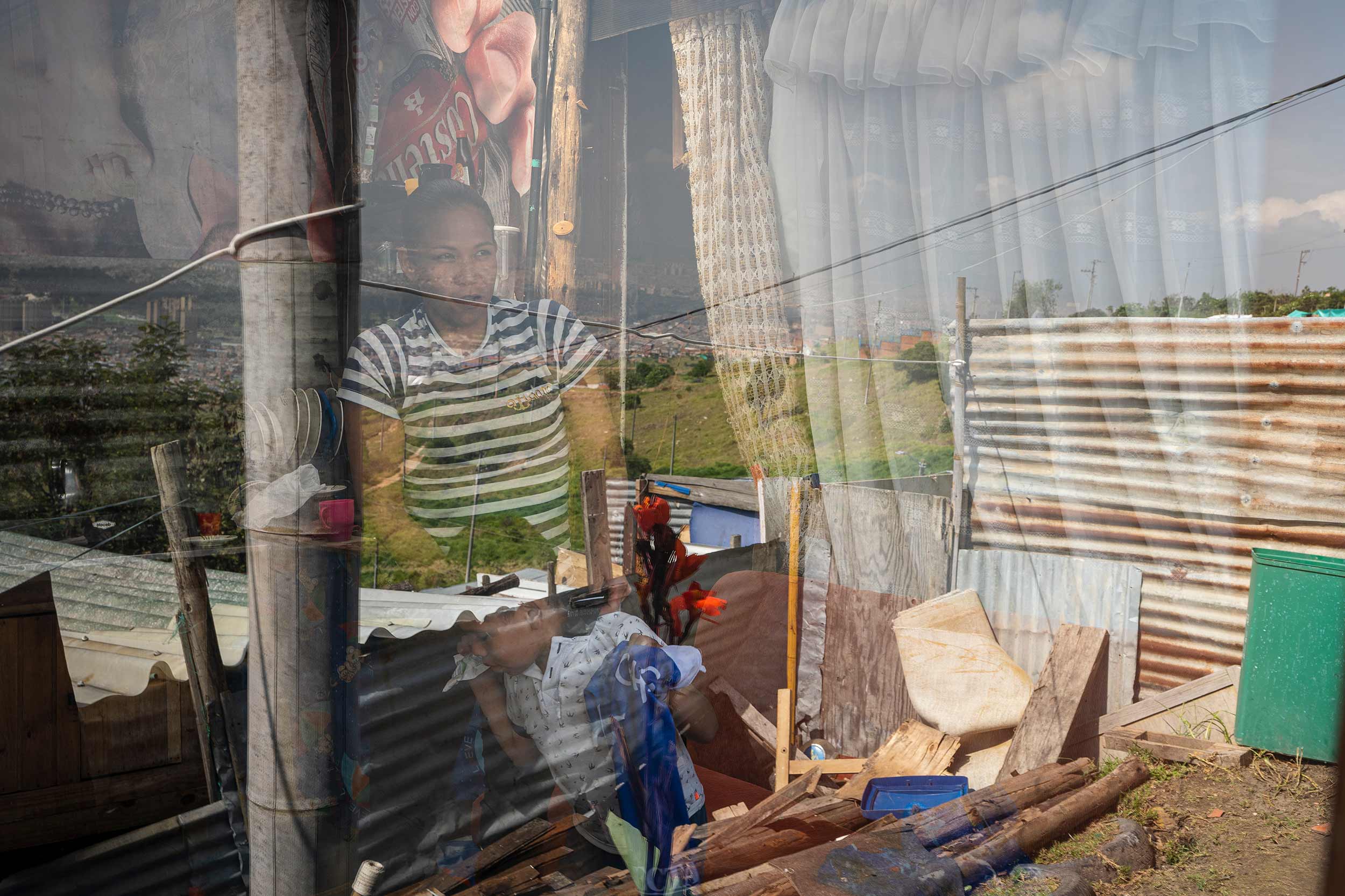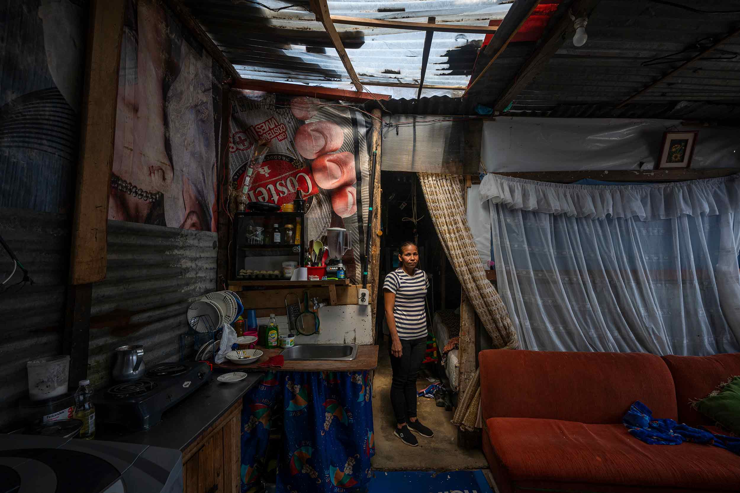 La casa tiene menos de 20 metros cuadrados. Un salón con un sofá rojo, una pequeña cocina con un único fogón y la habitación con una sola cama donde duermen los cuatro. Los niños duermen en el medio y ella y Jairo en las orillas para evitar que se caigan. En esta temporada de lluvias la situación ha sido muy difícil porque el único lugar de la casa en donde no hay goteras es justo en la cama.