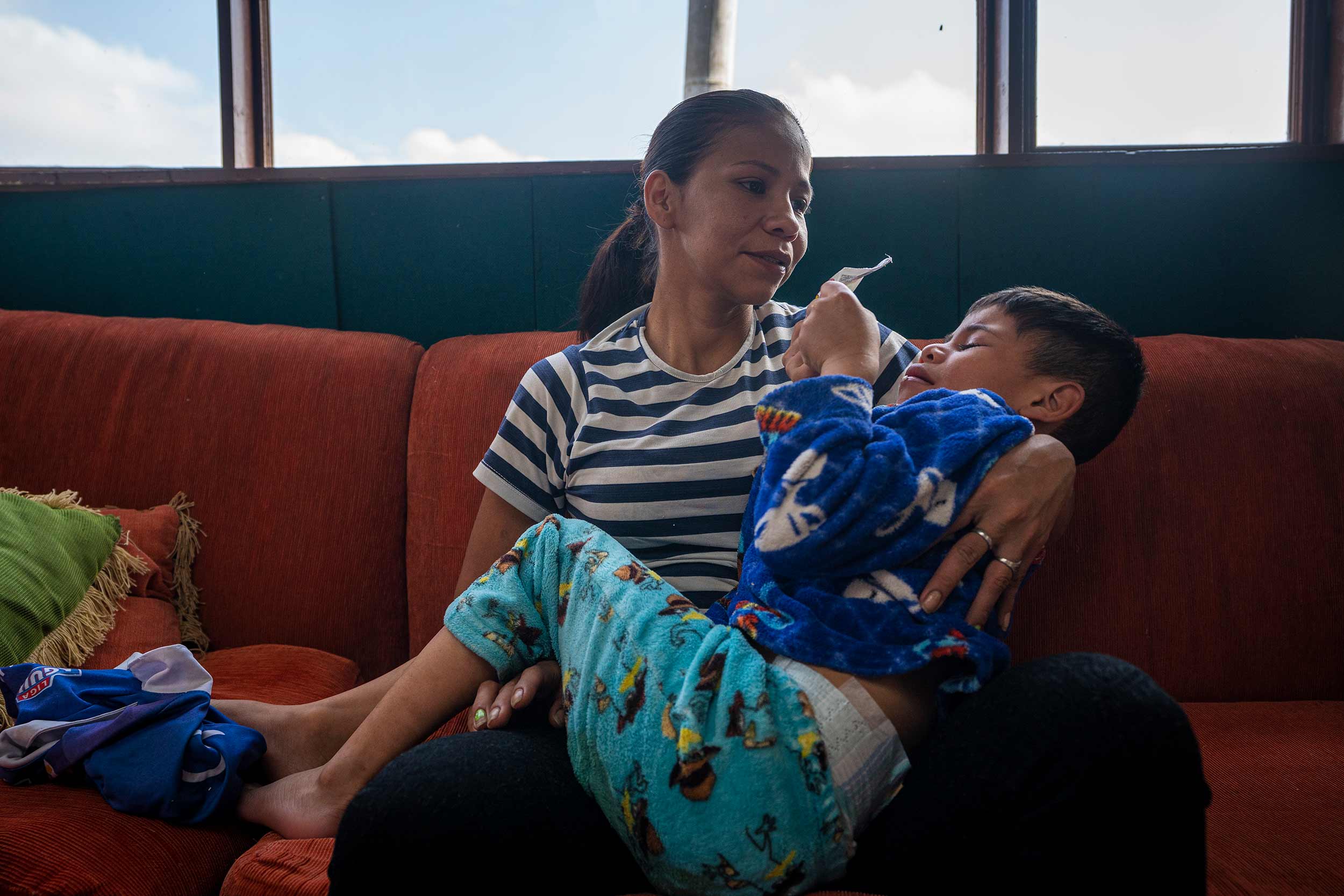 En una jornada normal, el matrimonio se levanta a las cinco de la mañana y tiende la cama. “Ya se sabe que, si no, los ángeles se quedan durmiendo”, dice. Su esposo se va a trabajar y ella lleva a su hijo John al colegio que queda subiendo la montaña. Cuando vuelve a casa le da el desayuno a Santiago y le hace terapias para ayudarlo con su recuperación.