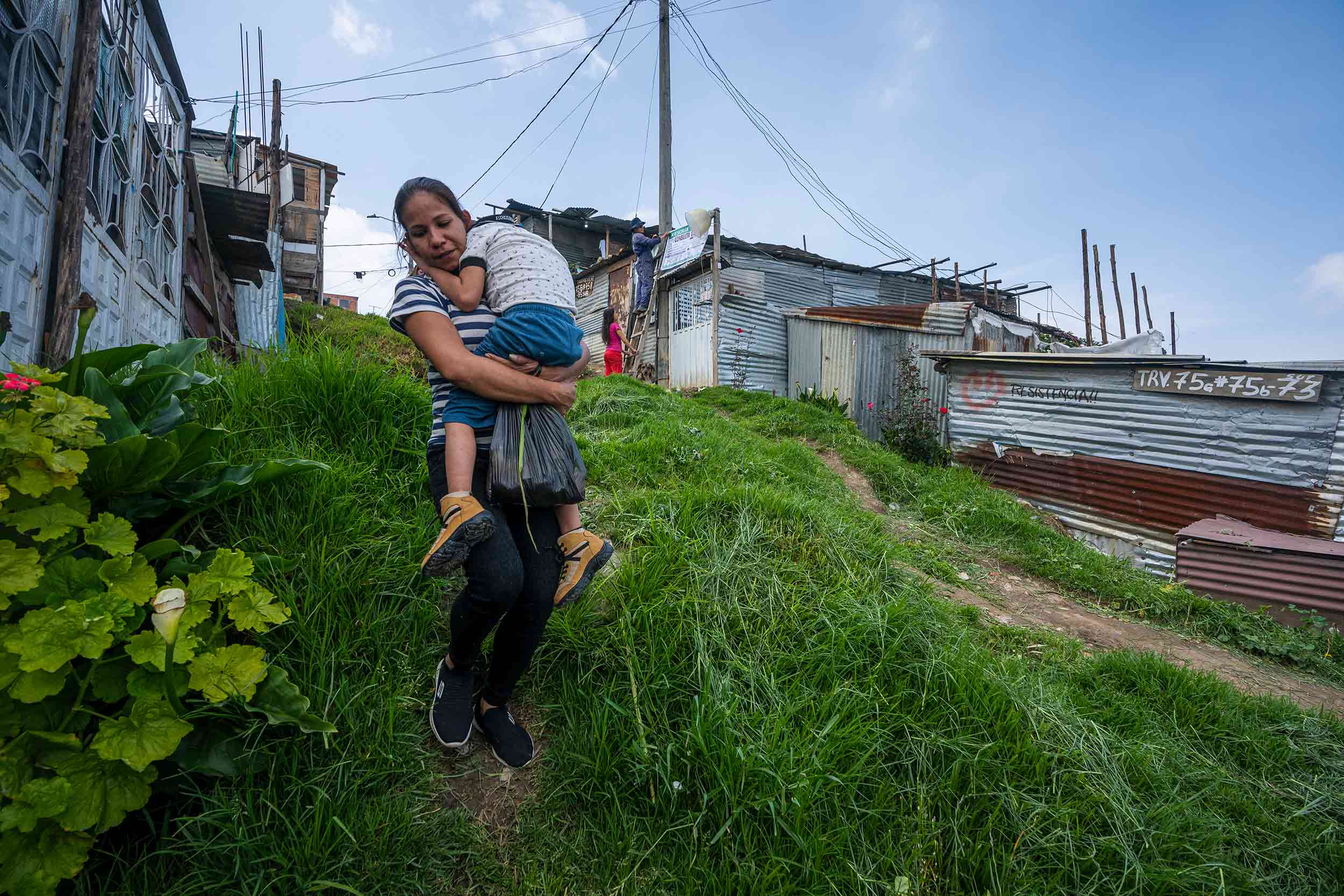 Primero conoció a la hermana de Jairo y después se enamoró de su actual pareja, con la que construyó un nuevo hogar. Vivían en un barrio del suroccidente de la capital hasta que llegó la pandemia y no lo pudieron seguir pagando. Unos amigos les hablaron de El Mirador, una invasión en las faldas de una montaña en la localidad de Ciudad Bolívar. Allí viven más de 400 personas en casas prefabricadas. Los vecinos decidieron ponerle al lugar El Mirador-La Esperanza porque todos tienen el anhelo de vivir algún día en un barrio legal, a donde lleguen los servicios públicos de la ciudad.