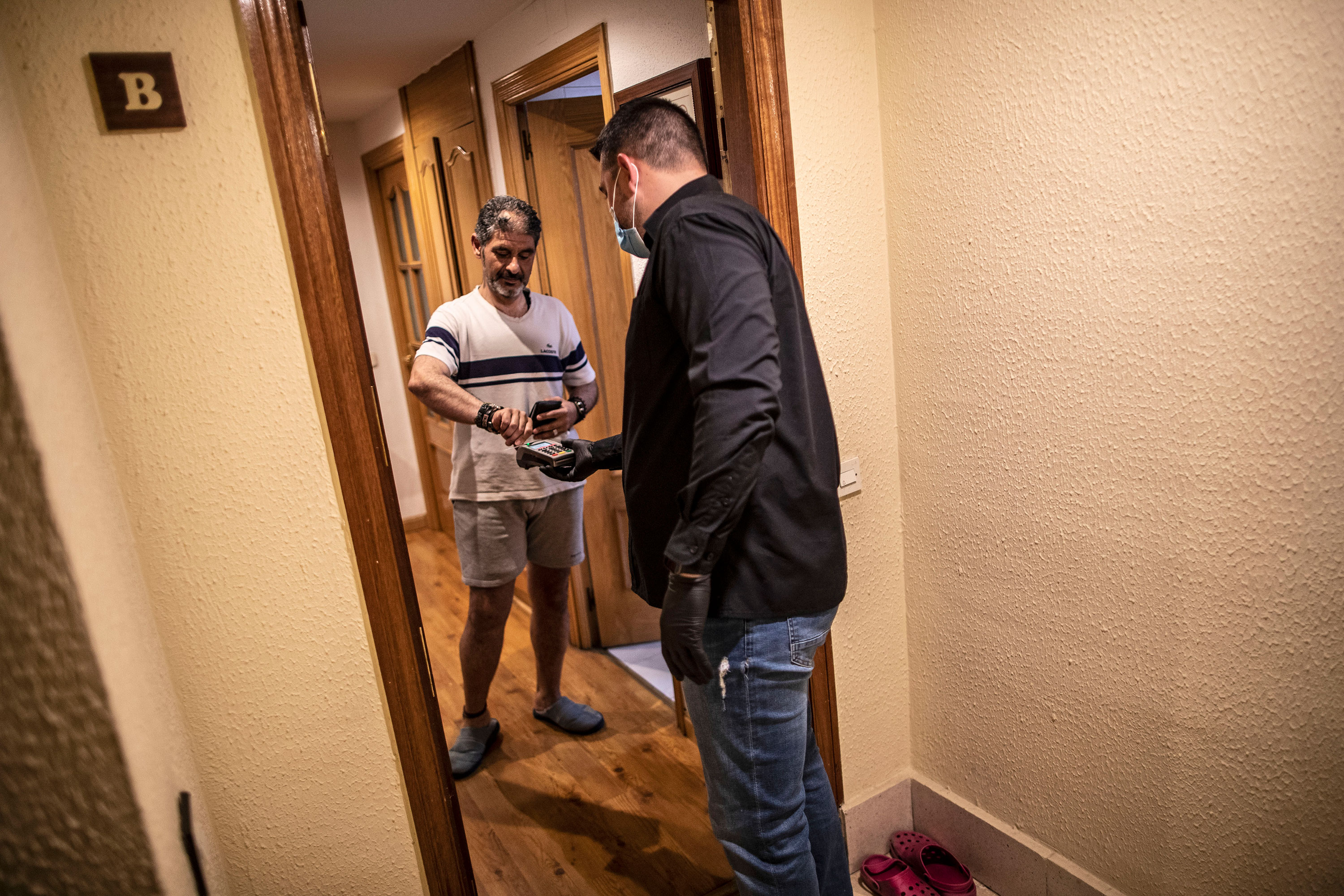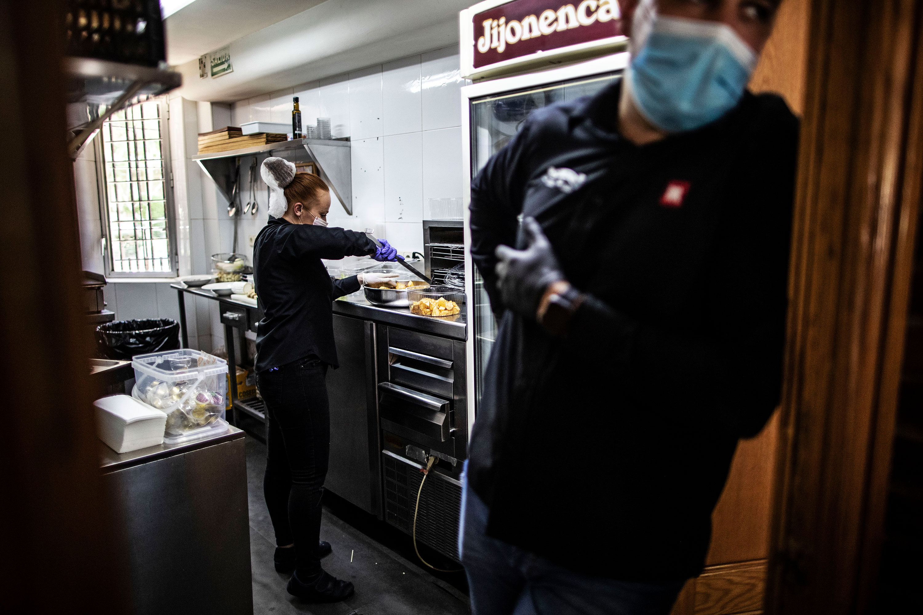 Su marido intenta ser positivo y apoyarse en que cada vez más vecinos “tiran de ellos”. Pero no se engaña. “La expectativa a largo plazo es jodida”, reconoce, “Más que nada porque las cuentas se acumulan”. Llevan dos meses sin pagar los 1.350 euros del alquiler del bar. El último recibo de la luz fue de 800 euros y siguen asumiendo parte de la tarifa de Vodafone por unos partidos de La Liga que hace semanas que nadie juega. Ya es la hora de entregar el pedido de Ignacio. Vive a pocos bloques del restaurante y Marcos irá caminando.
