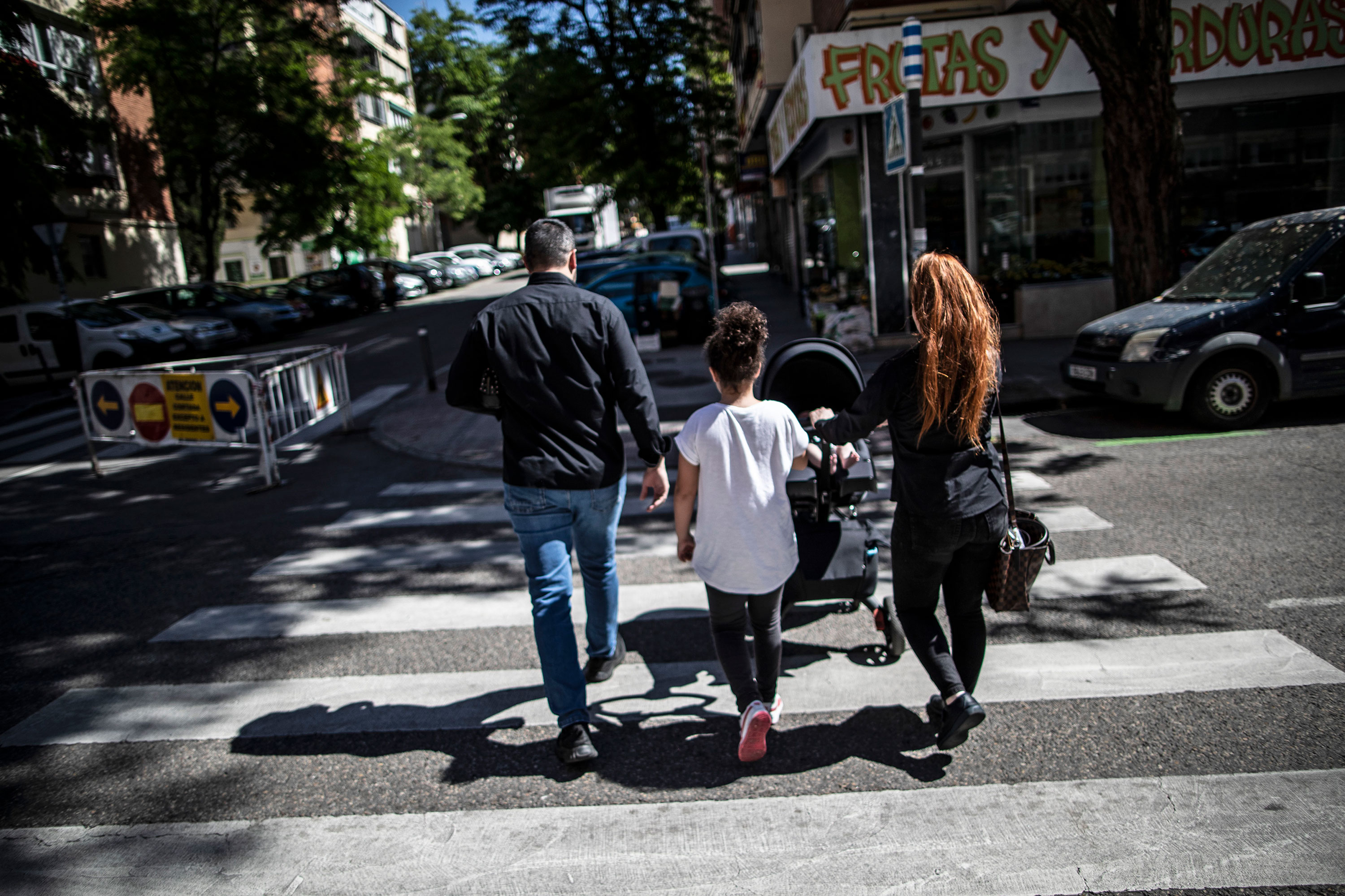 “Ahora toca ocuparse de ellos”, dice Marcos acariciando el pelo de la hija mayor. Llevan toda la mañana en casa de la abuela paterna, que vive en el edificio de enfrente de la familia Del Estal. La madre de Diana, que también reside en España, trabaja en una residencia de mayores. “Así que no hace falta ni que te diga por qué no los mandamos con ella”. Los pies blanquitos de Dylan buscan refugio en la sombra que arroja el carro. Hace 25 ºC y el sol pica. Aún así irán a dar un paseo por el bloque “por no estar en casa”. “Seguro que pronto todo vuelve a la normalidad, ¿verdad, hija?”, dice animada Diana, ahora más madre que dueña y cocinera.