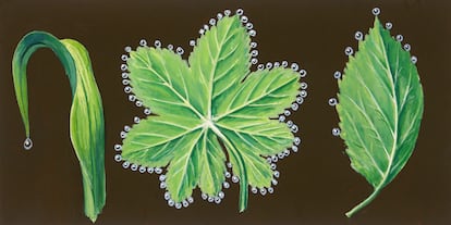 Las plantas también lloran, o eso parece. En numerosas ocasiones, las personas que cultivan plantas se habrán encontrado —muchas veces sin darse cuenta— con vegetales que emiten algún tipo de líquido. En todas ellas, la presencia de estos fluidos tiene una razón de ser. Una de estas situaciones que son más comunes es la de la gutación. Este curioso nombre se relaciona con el lloro de las hojas de ciertas plantas. Una mañana, al entrar en la habitación donde crece una oreja de elefante (Alocasia macrorrhizos), la aficionada a las plantas nota cómo el suelo por debajo de sus hojas está húmedo. La extrañeza surge de inmediato, porque recuerda que sí, la regó ayer mismo, pero nada del líquido cayó fuera. Y ahí es donde está la respuesta al enigma: ese último riego fue abundante, y la planta se ha visto con sus raíces envuelta en un sustrato muy húmedo. Así que, ni corta ni perezosa, la oreja de elefante se ha dedicado durante toda la noche a expulsar una parte de ese sobrante de agua a través de la punta de sus hojas. A su lado, un aglaonema (Aglaonema commutatum cv.) está igualmente llorando, ya que son muchas las especies que tienen esta peculiaridad de emitir agua a través de los poros.