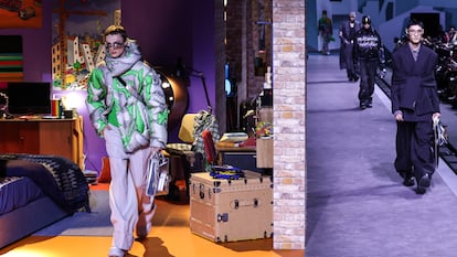 Convertir la moda en contenido viral es el sueño de toda firma de lujo. El desfile de la colección masculina de Louis Vuitton para el próximo otoño, presentado el pasado jueves en París, ha patentado un nuevo modo de lograrlo. Durante un cuarto de hora, los modelos que desfilaron por un escenario creado por Michel y Olivier Gondry inspirado en un dormitorio adolescente —y en el que no era difícil ver un homenaje a Virgil Abloh, director creativo de la marca hasta su repentino fallecimiento en 2021— lo hicieron en torno a una presencia capaz de domar cualquier escenario. Rosalía, elegida como comisaria musical del desfile, desgranó varios temas de Motomami y hasta tuvo tiempo para emocionarse con Camarón en una presentación cuyos límites exceden los del desfile tradicional y que apuesta por convertir la moda en entretenimiento.